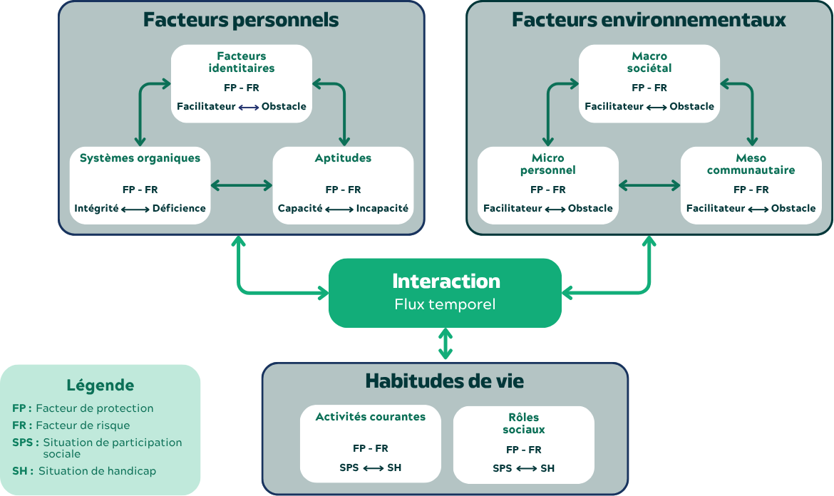 Selon le Modèle de développement-humain – Processus de production du handicap 2 (MDH-PPH2), la situation de handicap apparaît lors d’une variation de la participation sociale ou de la réalisation des habitudes de vie d’une personne, et que celle-ci découle de l’interaction, ou du bris de celle-ci, entre les facteurs personnels et l’environnement. Elle est donc placée dans un cadre temporel précis.
